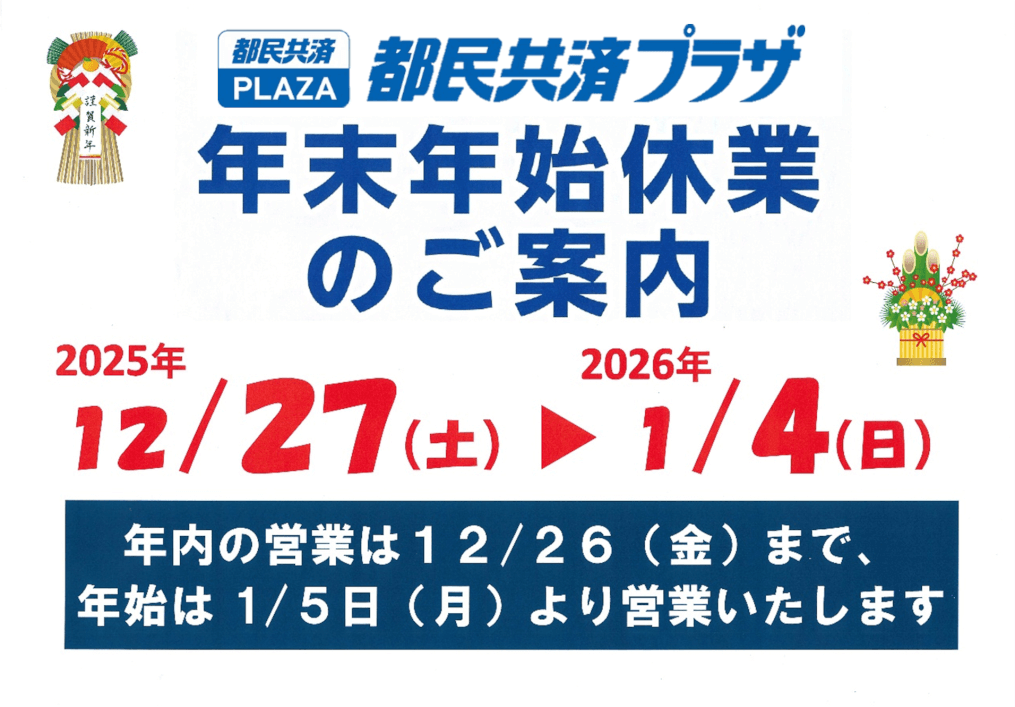 さて、都民共済プラザでは誠に勝手ながら、下記期間を年末年始休業とさせていただきます。
